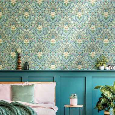 Precio 4,95 €¡Elegante papel pintado con un maravilloso diseño floral sobre fondo turquesa con flores y hojas en tonos dorados, rosas y verdes!.