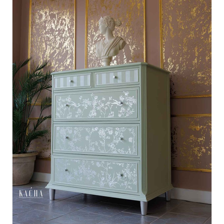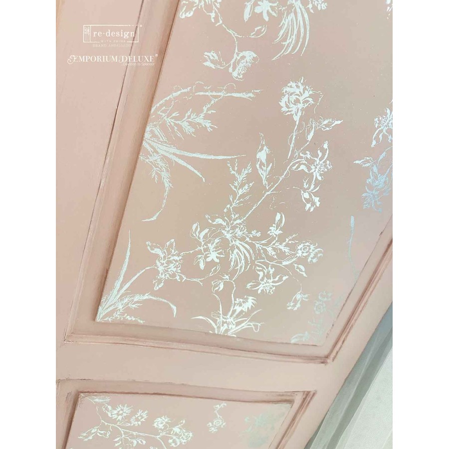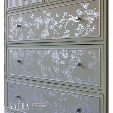Eleve sus muebles a nuevas cotas de elegancia con la transferencia decorativa “Silver Bird”. Diseñada con el toque de glamour característico de Kacha, esta transferencia presenta elegantes pájaros posados en delicadas ramas, todo ello representado en una impresionante lámina plateada que añade una calidad lujosa y reflectante a sus piezas. Los intrincados detalles de las flores y los pájaros rezuman sofisticación, lo que la hace perfecta para cualquiera que busque infundir a su decoración un toque de belleza refinada. Ya sea que esté transformando una cómoda vintage o añadiendo estilo a una pieza moderna, “Silver Bird” aporta un toque de elegancia atemporal que deslumbra con cada mirada.