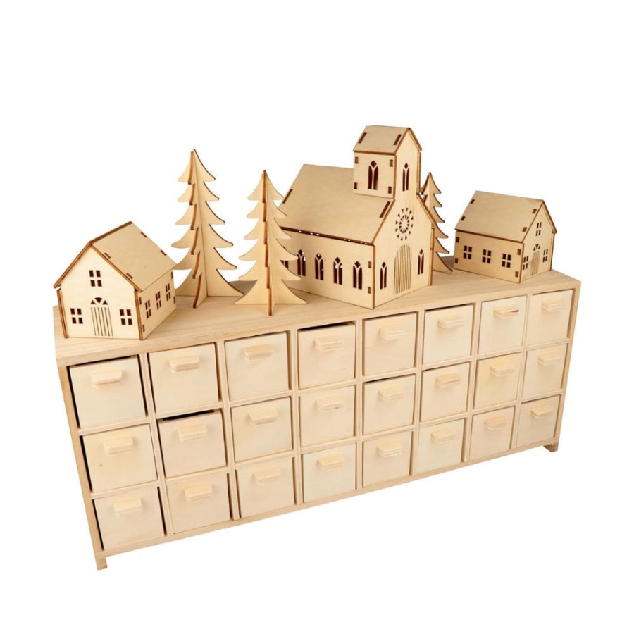 1. Calendario de adviento con decoración de poblado en la parte superior. Medidas: 50x9,5x34cm. Incluye poblado en madera de chopo de 6mm con base y peana, números del 1 al 24 calados en circulo a medida para los cajoncitos y calendario de adviento con 24 cajoncitos (48x18,5x7cm) ref-0308110000