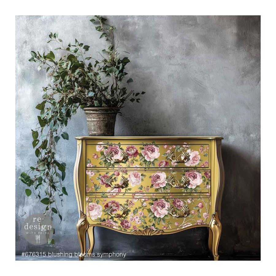 El diseño viene dividido en 4 hojas, midiendo cada una 30,48 x 44,45cm Blushing Blooms Symphony de Kacha, está repleta de suaves rosas y follaje colgante, aportando un aire de romance atemporal a muebles y decoración del hogar. Su intrincado diseño puede usarse como una composición completa o recortarse para crear diseños personalizados en cómodas, mesas, armarios y más..