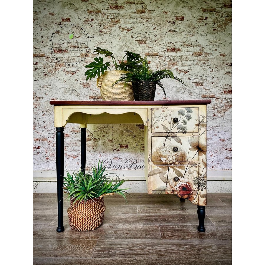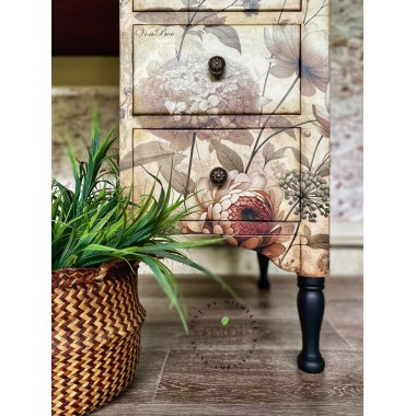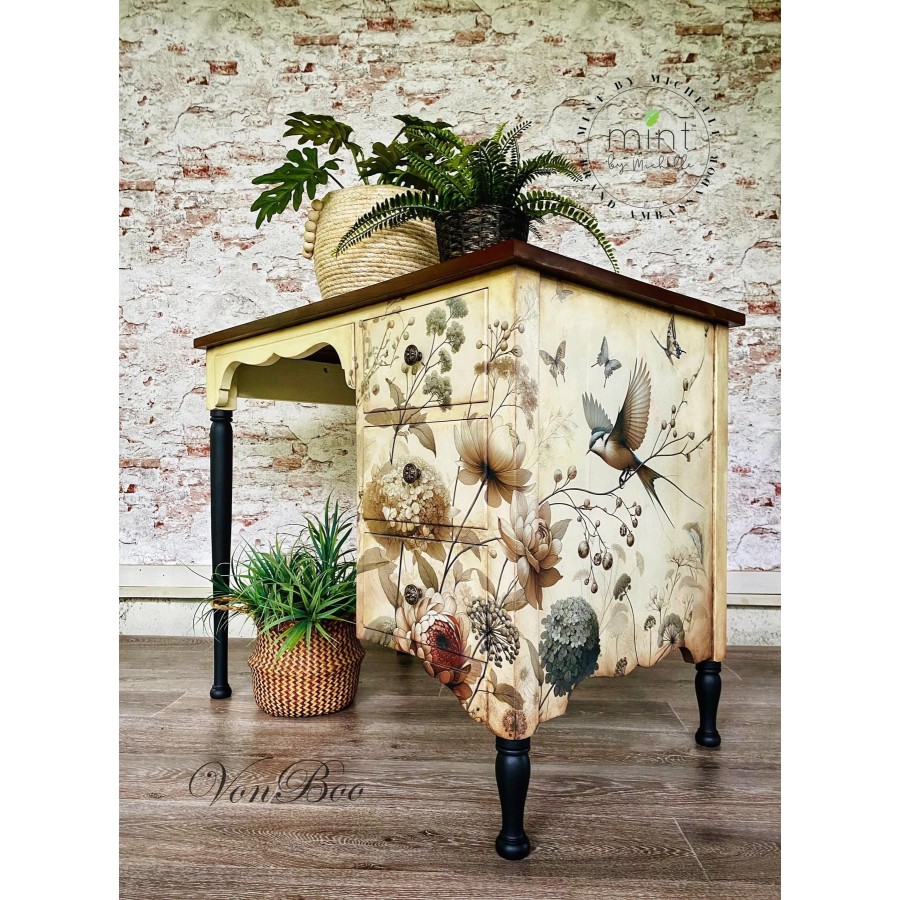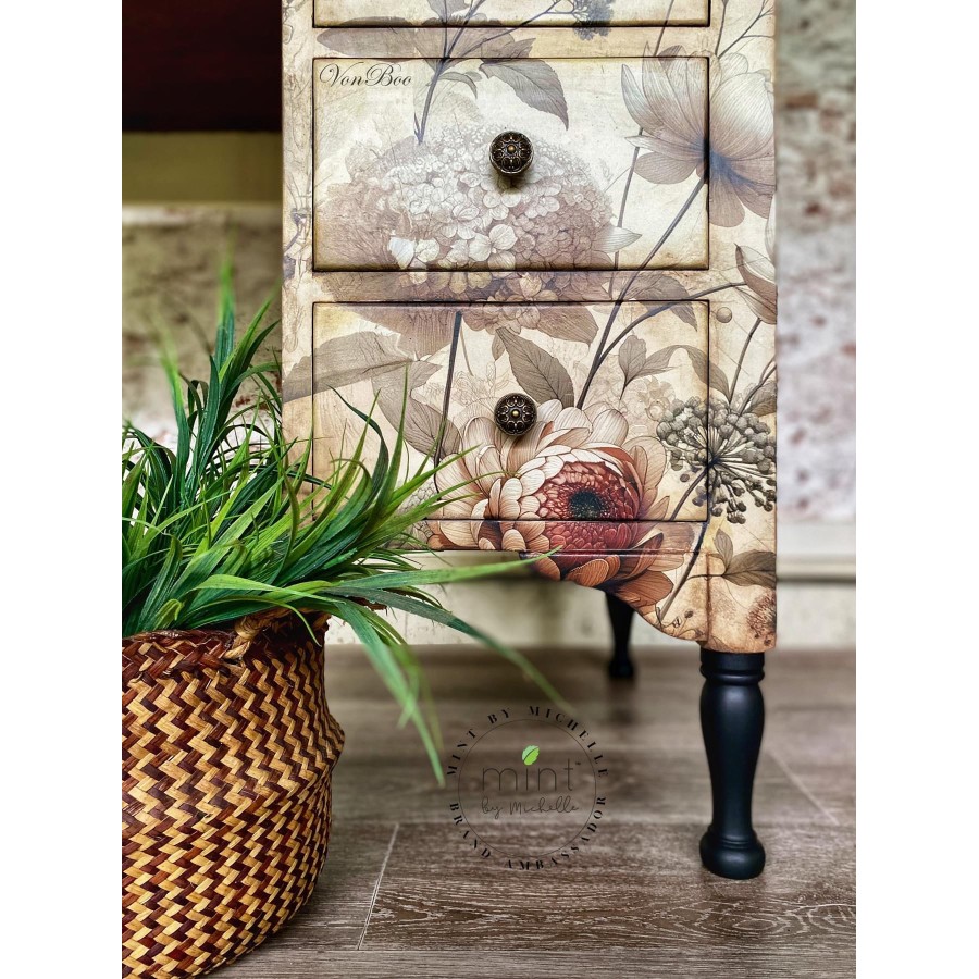 Recomendamos utilizar los papeles para decoupage Mint by Michelle con Chalk Paint. Los tutoriales de aplicación están disponibles en línea en https://mintbymichelle.com/blogs/news