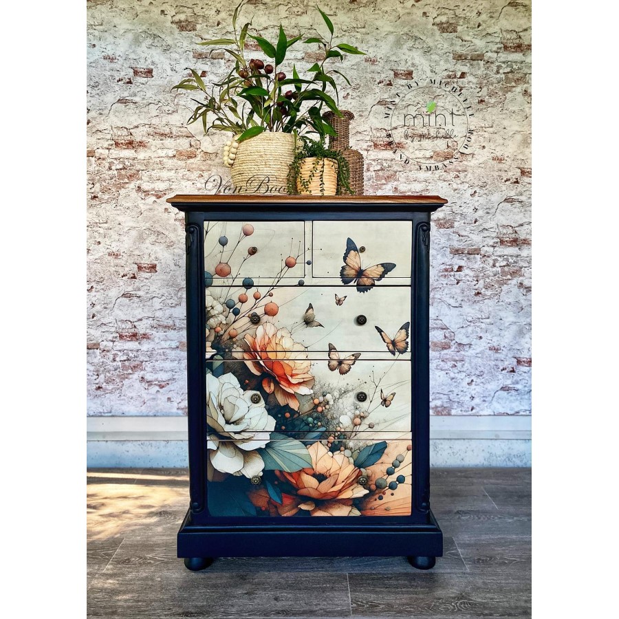 Recomendamos utilizar los papeles para decoupage Mint by Michelle con Chalk Paint. Los tutoriales de aplicación están disponibles en línea en https://mintbymichelle.com/blogs/news