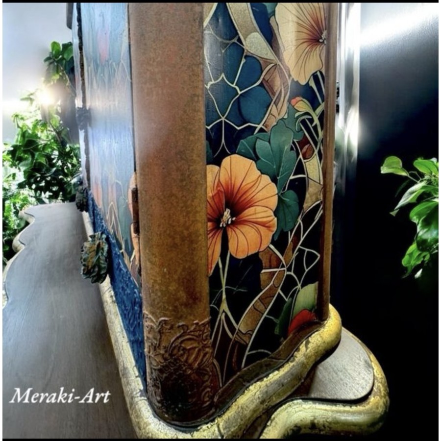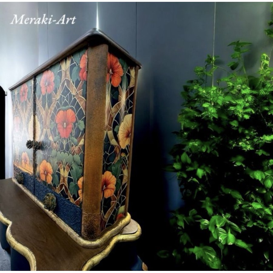 Es un precioso mueble de Nogal, al que hemos decorado aplicando un papel de copas de MíNt by Michelle , Varias técnicas de pintura entre ellas estén sintético y óxido. Tiene unos apliques de bronce tanto en la parte del buffet, como en la parte del altillo. Puede ser utilizado como mueble de entrada o como mueble bar, dado que tiene en el interior Luz y una balda de cristal aparte de los cajones puede colocarse en una pieza como se ve en la tele o puede colgarse el altillo en alto aprovechando el bufet para apoyar aquello que necesitemos Como botellas vasos, cuando utilizamos como Mueble, bar