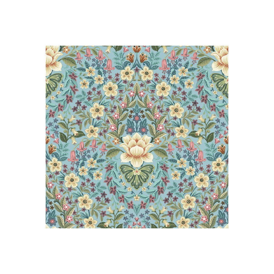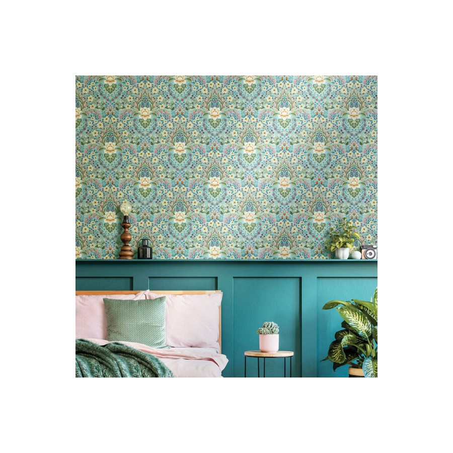 ¡Elegante papel pintado con un maravilloso diseño floral sobre fondo turquesa con flores y hojas en tonos dorados, rosas y verdes!