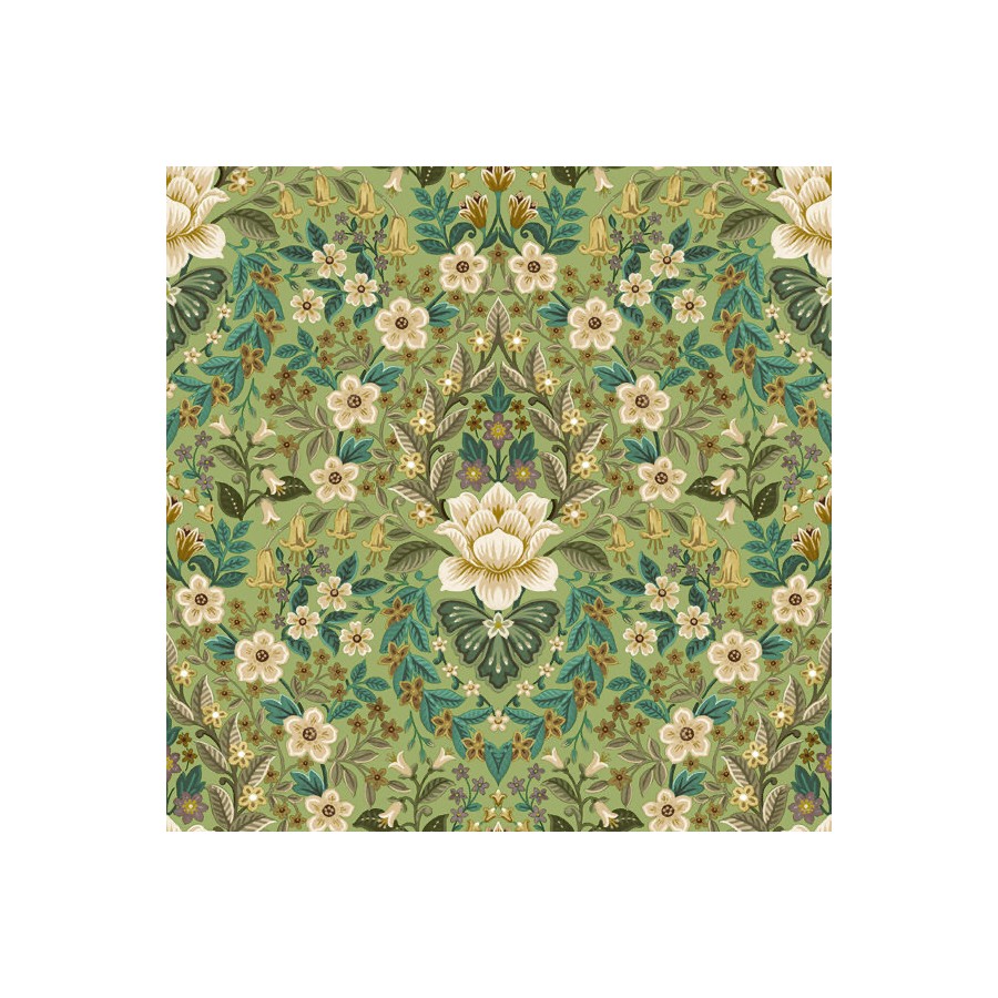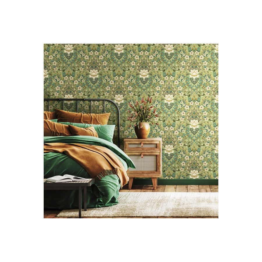 ¡Elegante papel pintado con un maravilloso diseño floral sobre fondo verde con flores beige, doradas y blancas y hojas en tonos verdes y beige!
