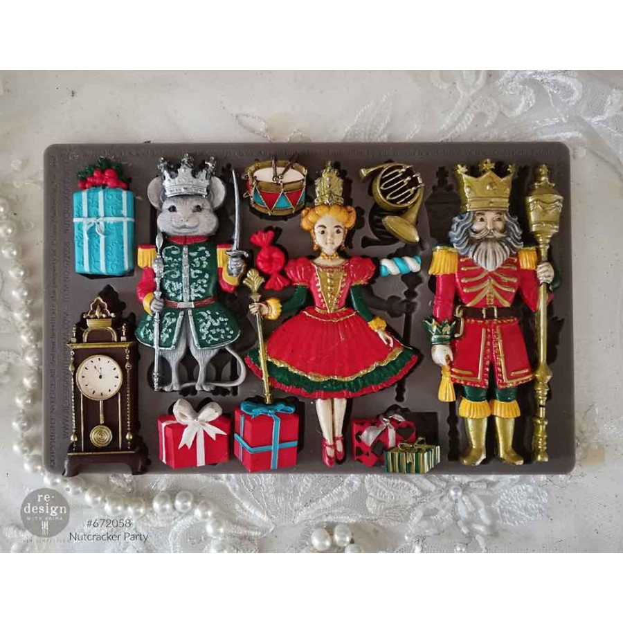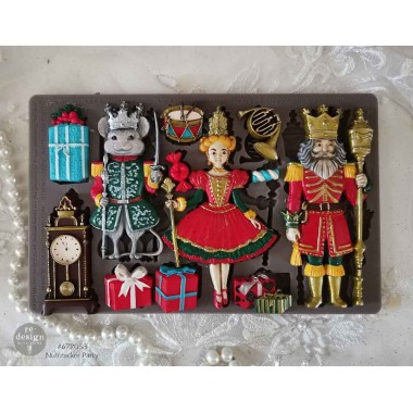 Dale vida a la magia encantadora del ballet Cascanueces con “Fiesta del Cascanueces”. Este molde te invita a darle vida a los personajes más queridos del ballet en tu decoración, con el valiente Cascanueces, la elegante Hada de Azúcar y el travieso Rey de los Ratones (o Rey Rata). Imagina crear una impresionante pieza de arte mural que cuente la historia de su caprichosa aventura, con detalles intrincados como regalos encantadores y un reloj de pie clásico que se suman a la escena festiva. Perfecto para agregar un toque de elegancia teatral y magia navideña a tu hogar. CÓMO USAR: Lo que distingue a este molde es su versatilidad. No solo es adecuado para proyectos de bricolaje y manualidades, sino que también es apto para alimentos y horno, lo que abre un mundo de posibilidades culinarias. Ya sea que trabajes con resina, pegamento caliente, material de modelado, fondant, chocolate u otros medios vertibles o moldeables, este molde te permite crear tus propios moldes y decoraciones de alimentos con facilidad. ¡Coordina con todos los diseños de Cascanueces!