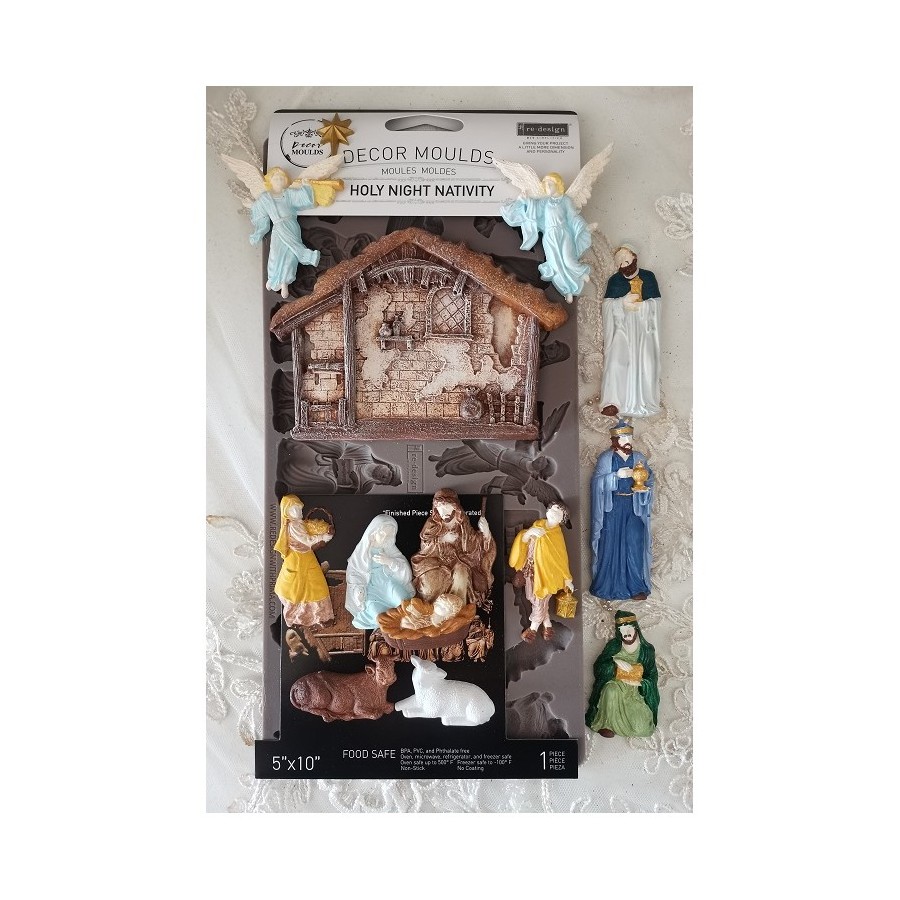 Este detallado molde presenta un belén completo, con la Sagrada Familia, los Reyes Magos, ángeles, el establo y más. Cada figura está bellamente esculpida para aportar reverencia y significado a tus creaciones navideñas. El Molde de Decoración de Nacimiento Nochebuena® es perfecto para candelabros, paneles de técnica mixta, adornos o para crear piezas de reliquia que cuenten la verdadera historia de la Navidad.
