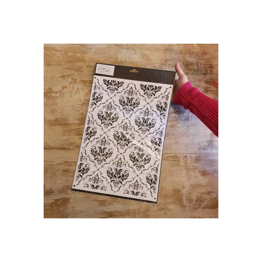 Preciosa plantilla decorativa reutilizable, con damascos repetidos, para decorar ambientes clásicos o modernos, con un toque elegante.