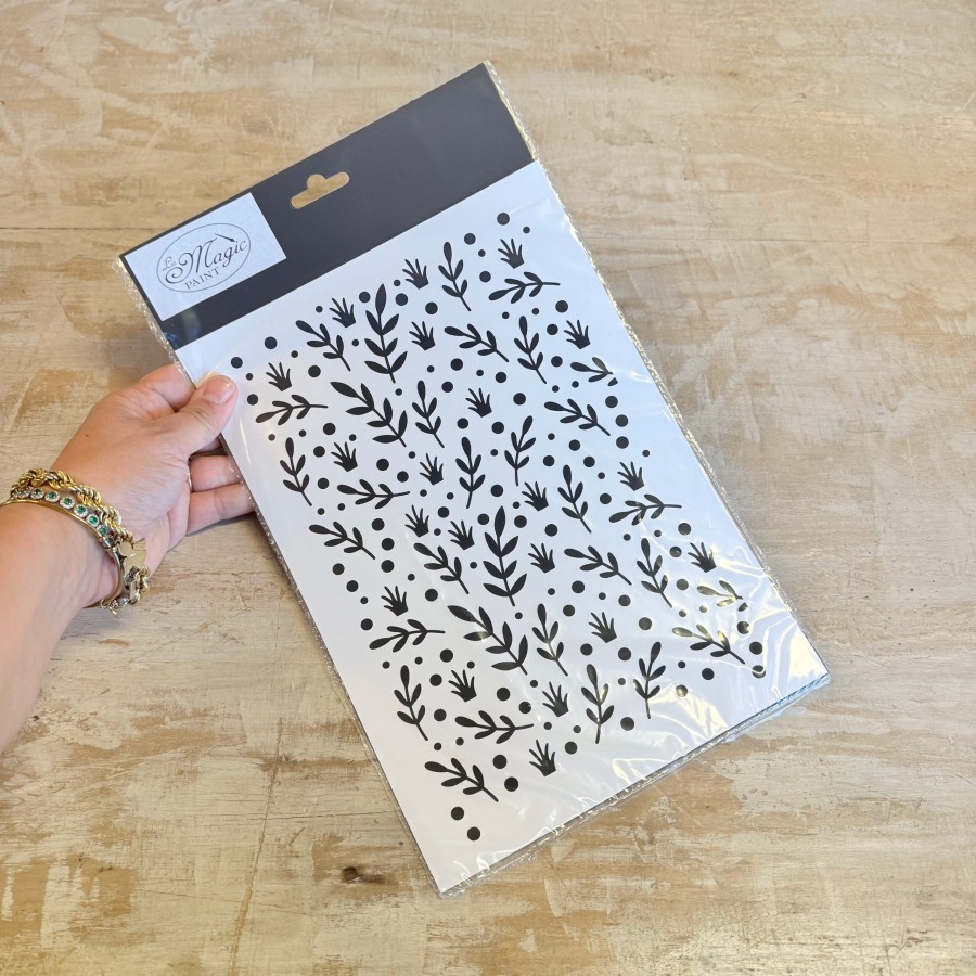 Preciosa plantilla decorativa reutilizable “Plantas de Lunares” compuesta de plantas altas y bajas para embellecer y crear un efecto naturaleza en tus muebles.