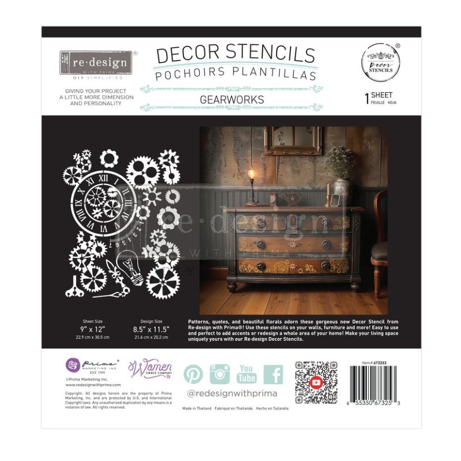 Transforma tus muebles y proyectos de decoración con la plantilla decorativa "GearWorks". Esta versátil plantilla presenta una serie de intrincados engranajes y elementos mecánicos, perfectos para añadir un toque steampunk a cualquier superficie. Combina a la perfección con los moldes de Finnabair, incluyendo "Machine Parts", "Large Gears" y "Mechanica", lo que le permite crear diseños cohesivos e impresionantes. Nuestras plantillas de decoración son muy divertidas de usar. Pruebe a combinarlas con cualquiera de las pastas de tiza, ceras decorativas o acrílicos de brillo metálico de Redesign, así como con las pinturas, pastas y ceras Finnabair, ¡para conseguir efectos impresionantes! 1 unidad, tamaño de hoja 9 "x12".