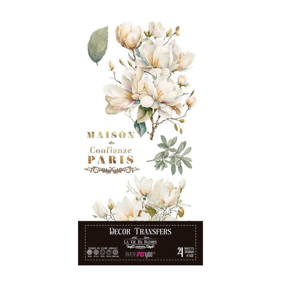 - Diseño exquisito: Cuatro hojas de transferencia con impresionantes ilustraciones de flores de Magnolias que aportarán un aire delicado y romántico a tus creaciones.