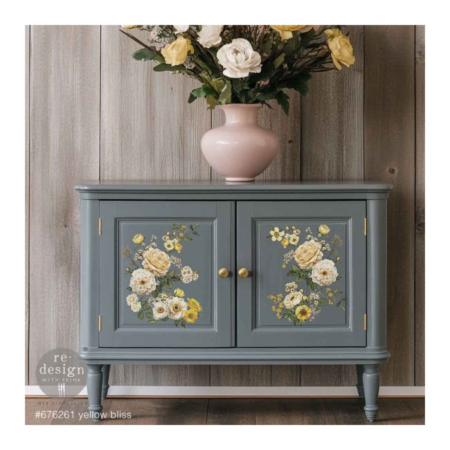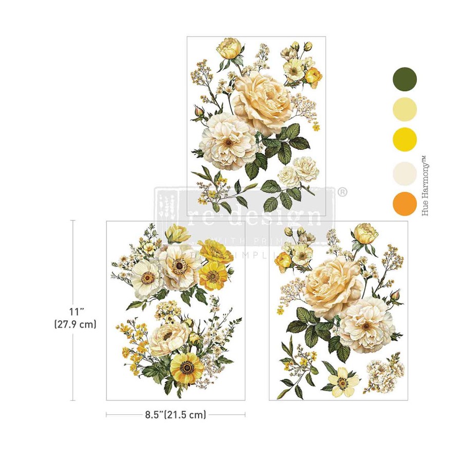 Yellow Bliss incluye tres láminas de flores de color amarillo dorado, rosas color crema y hojas de color verde intenso, que aportan un toque rico y alegre a muebles y decoración. Cada lámina ofrece diferentes arreglos florales que aportan calidez y encanto y que pueden combinarse o usarse por separado, lo que permite infinitas posibilidades creativas.