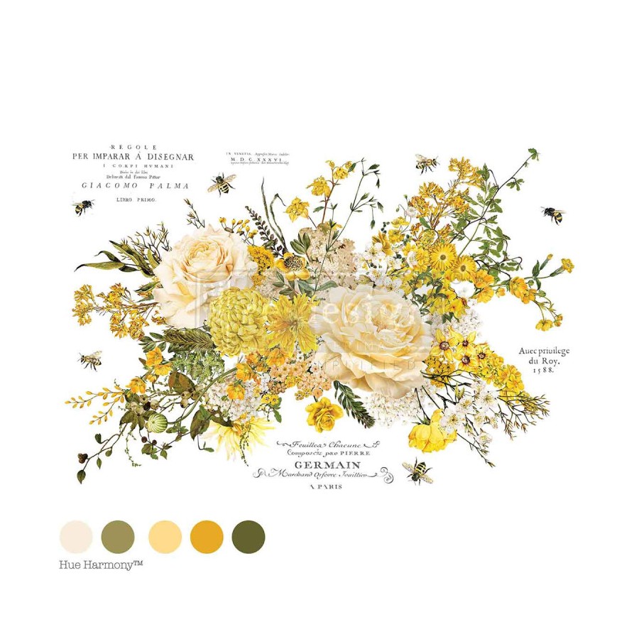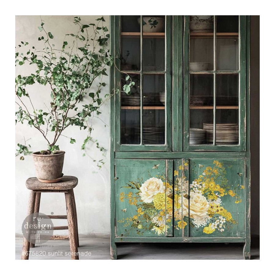 ¡Hola, sol! Sunlit Serenade es como una tarde dorada envuelta en flores: cálida, luminosa y llena de vida. Imagina rosas color crema y alegres flores amarillas bailando con la brisa mientras pequeñas abejas zumban para unirse a la fiesta. Este Decor transfer® de Redesign with Prima® dará un brillo instantáneo a cualquier proyecto.